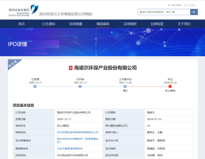 日前,你公司向本所提交了《海诺尔环保产业股份有限公司关于撤回首次公开发行股票并在创业板上市申请文件的申请》,保荐人向本所提交了《申万宏源证券承销保荐有限责任公司关于撤回海诺尔环保产业股份有限公司首次公开发行股票并在创业板上市申请文件的申请》。根据《深圳证券交易所股票发行上市审核规则(2024 年修订)》第六十二条的有关规定,本所决定终止对你公司首次公开发行股票并在创业板上市的审核。