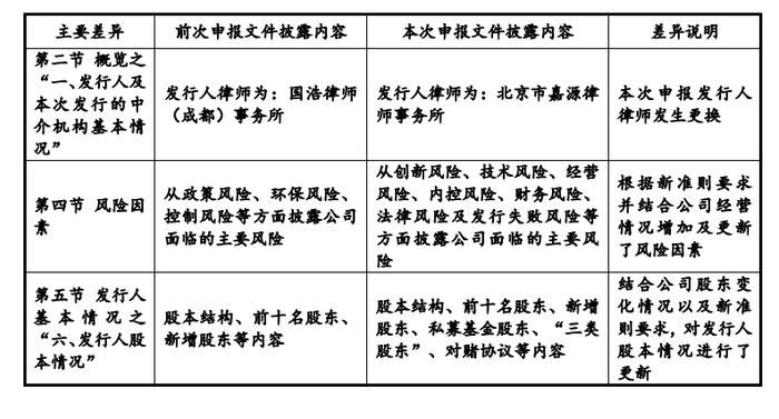 除上述招股说明书新准则要求及IPO申报期的不同导致本次申请材料内容存在差异外,发行人还根据最新的股东情况、董监高情况、业务发展情况、行业发展情况、统计数据等对招股说明书进行了更新和调整。现将本次招股说明书与前次招股说明书的主要差异情况说明如下: