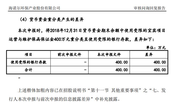 2018年5月4日,宜宾海诺尔在中国民生银行股份有限公司成都分行申请开具了一份编号为公保函字第2001DG18000171号的《运营与维护(履约)保函》(以下简称保函),保函受益人为宜宾市住房城乡建设和城市管理局,保函金额400万元,期限为2018年5月4日至2021年5月4日。前次申报文件中,截至2018年12月31日,货币资金余额列示为43,939,070.85元,其中使用受限的银行存款为0元,即未将该400万元作为受限制货币资金披露。