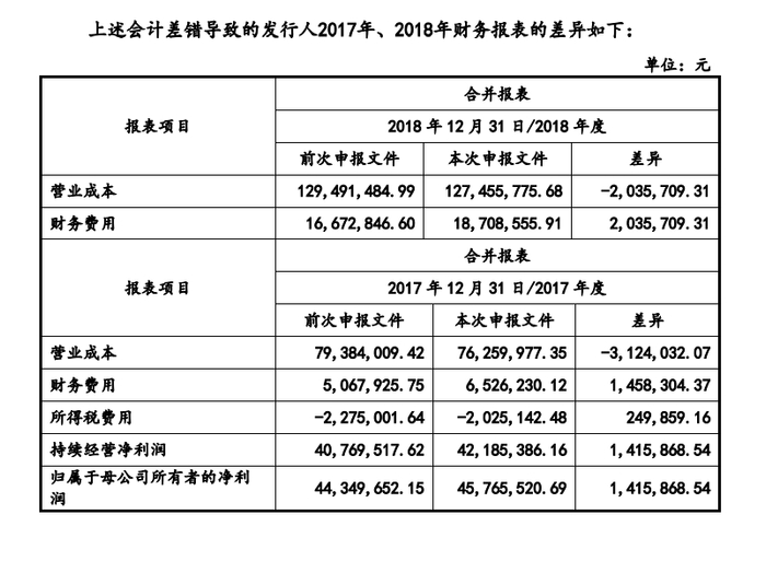本次申报文件与前次申报文件中财务会计信息的主要差异如下:
