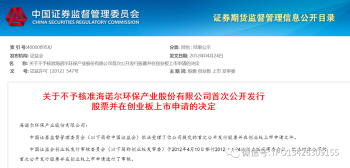 关于不予核准海诺尔环保产业股份有限公司首次公开发行