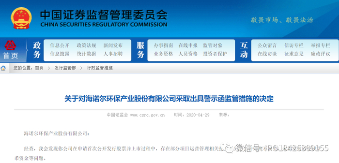 2019 年 6 月,发行人向中国证监会提交了创业板 IPO 申请,2019 年 11 月接受了监管部门现场检查。2020 年 4 月 28 日,中国证监会向发行人出具了《关于对海诺尔环保产业股份有限公司采取出具警示函监管措施的决定》([2020]20号),警示函涉及的具体内容如下: