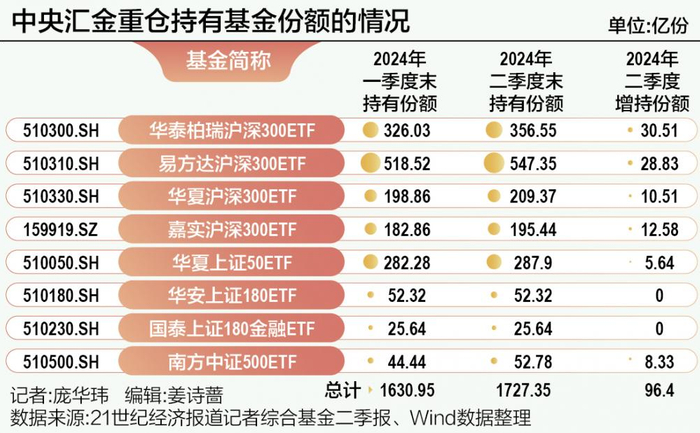 具体包括中央汇金投资持有8只ETF份额,分别为:华泰柏瑞沪深300ETF356.55亿份、易方达沪深300ETF547.35亿份、华夏沪深300ETF209.37亿份、嘉实沪深300ETF195.44亿份、华夏上证50ETF287.90亿份、南方中证500ETF52.78亿份、华安上证180ETF52.32亿份、国泰上证180金融ETF25.64亿份。此外,还有中央汇金资产二季度末持有易方达深证100ETF6.93亿份。