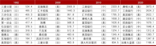 表1 1992—2020年全球市值前十大银行(亿美元)