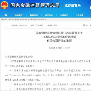 作为合资方之一,江苏金租7月20日发布公告称,将推动江苏法巴金租严格按照法律法规和监管要求履行有关程序,尽快开业运营。