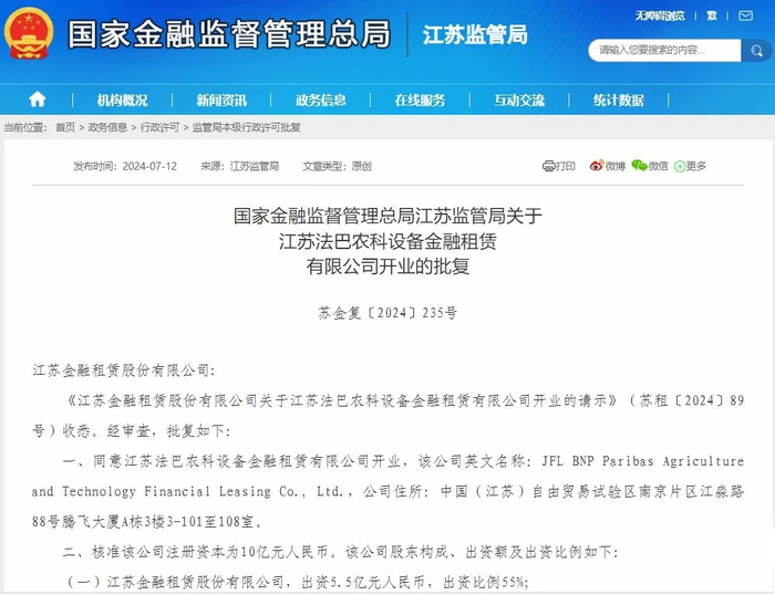 日前,江苏法巴农科设备金融租赁有限公司(以下简称“江苏法巴金租”)获准开业。根据批复,江苏法巴金租可转让和受让融资租赁资产、接受承租人的租赁保证金,开展农业、科技融资租赁业务、租赁物变卖及处理业务等。