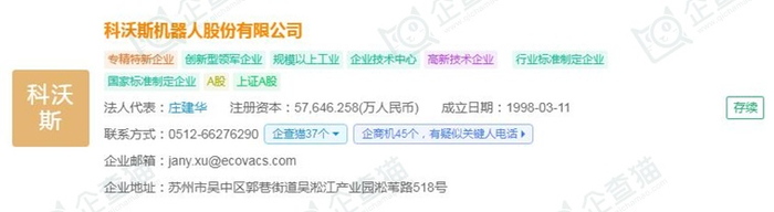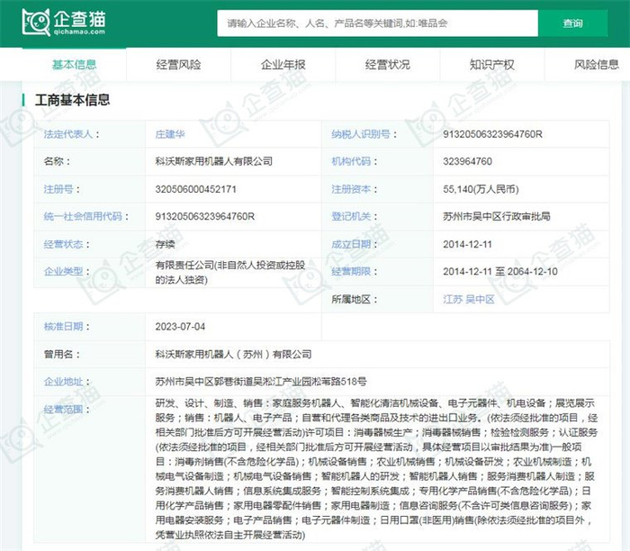 据企查猫显示,科沃斯机器人股份有限公司成立于1998年03月11日,注册资本57,646.258万人民币,法定代表人庄建华,公司经营范围包括:研发、设计、制造家庭服务机器人、智能化清洁机械及设备、电子产品及相关零部件、机电产品、非金属模具,货物和技术的进出口(不含分销业务),销售公司自产产品。(依法须经批准的项目,经相关部门批准后方可开展经营活动)等。