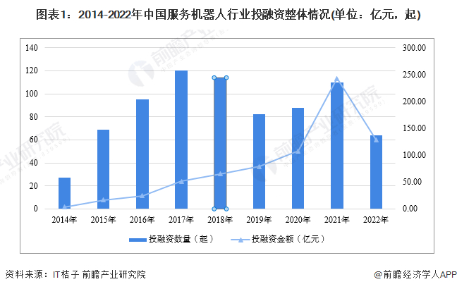 根据IT桔子数据库,2021年我国服务机器人行业融资达到顶峰,发生融资事件共110起,融资金额共242.99亿元。从近几年行业投融资数量与金额来看,虽然投融资数量在2018-2019年发生下降,但行业投融资金额不断攀升,截止2022年9月14日,我国服务机器人行业发生融资事件64起,融资金额为128.99亿元,总的来看,服务机器人行业热度正高,资本市场较活跃。