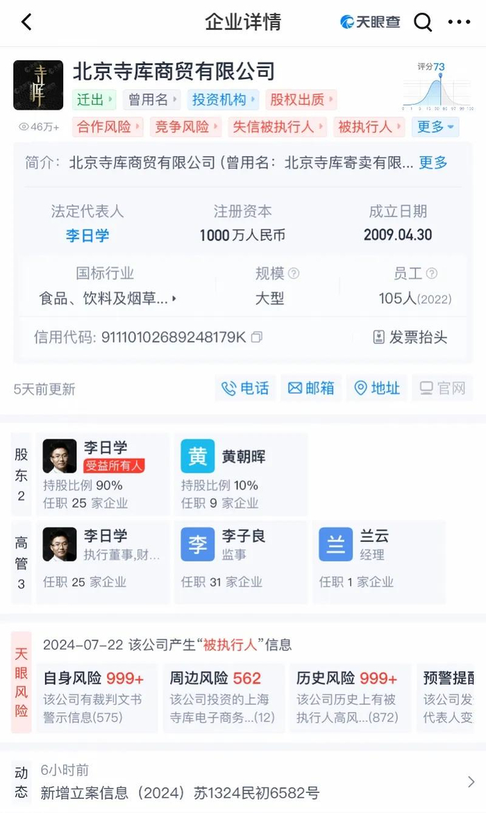 记者通过天眼查获悉,寺库所属企业为北京寺库商贸有限公司,成立于2009年4月,法定代表人为李日学,目前标注为失信被执行人、被执行人、限制高消费和股权冻结等风险信息。作为失信被执行人,全部未执行数量为120件,未履行比例为100%。作为被执行人,被执行总金额为2950.93万元。