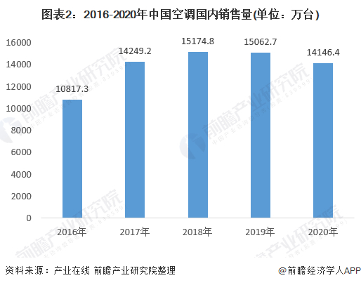 2016-2020年中国空调国内销售量呈波动变化,2018年空调销量达到顶峰,为15174.8万台;受疫情影响,2020年空调国内销售量为14146.4万台,同比下降6%。