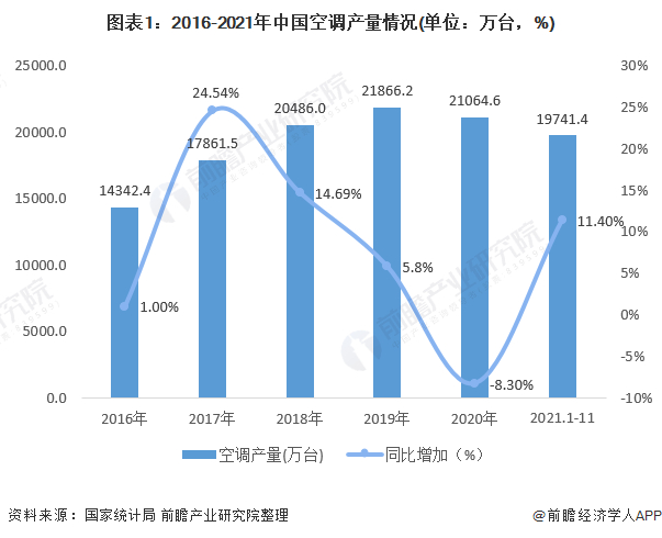 国家统计局公布数据显示,2010-2016年我国空调产量较为稳定,2017年-2019年,受库存、天气,以及三四级市场需求提升的影响下,我国空调产量不断增加,2019年空调产量达到顶峰为21866.2万台。受疫情影响,2020年中国空调产量达到21064.6万台,同比下降8.3%。2021年,经济有所好转,1-11月空调产量为19741.4万台,同比上升11.4%