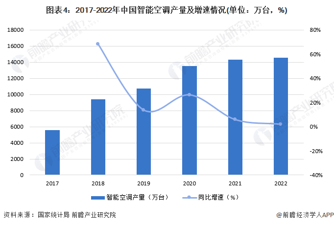 随着传统空调市场增长放缓,家电企业开始寻找空调市场新的增长点,智能空调逐渐受到大型家电企业的重视,我国智能空调市场逐步发展。根据智能空调渗透率以及我国空调产量进行初步测算,2022年我国智能空调产量约在1.46亿台,同比增长1.89%。