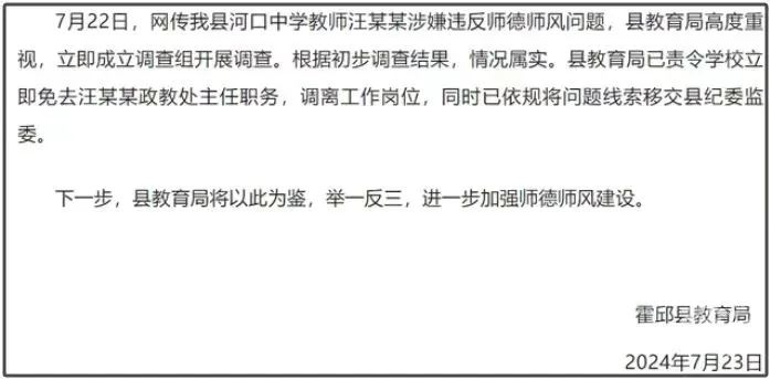 据微信公众号“霍邱发布”7月24日凌晨消息,安徽霍邱县教育局发布通报称,7月22日,网传该县河口中学教师汪某某涉嫌违反师德师风问题,县教育局高度重视,立即成立调查组开展调查。根据初步调查结果,情况属实。县教育局已责令学校立即免去汪某某政教处主任职务,调离工作岗位,同时已依规将问题线索移交县纪委监委。下一步,县教育局将以此为鉴,举一反三,进一步加强师德师风建设。