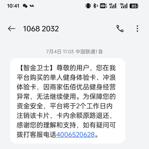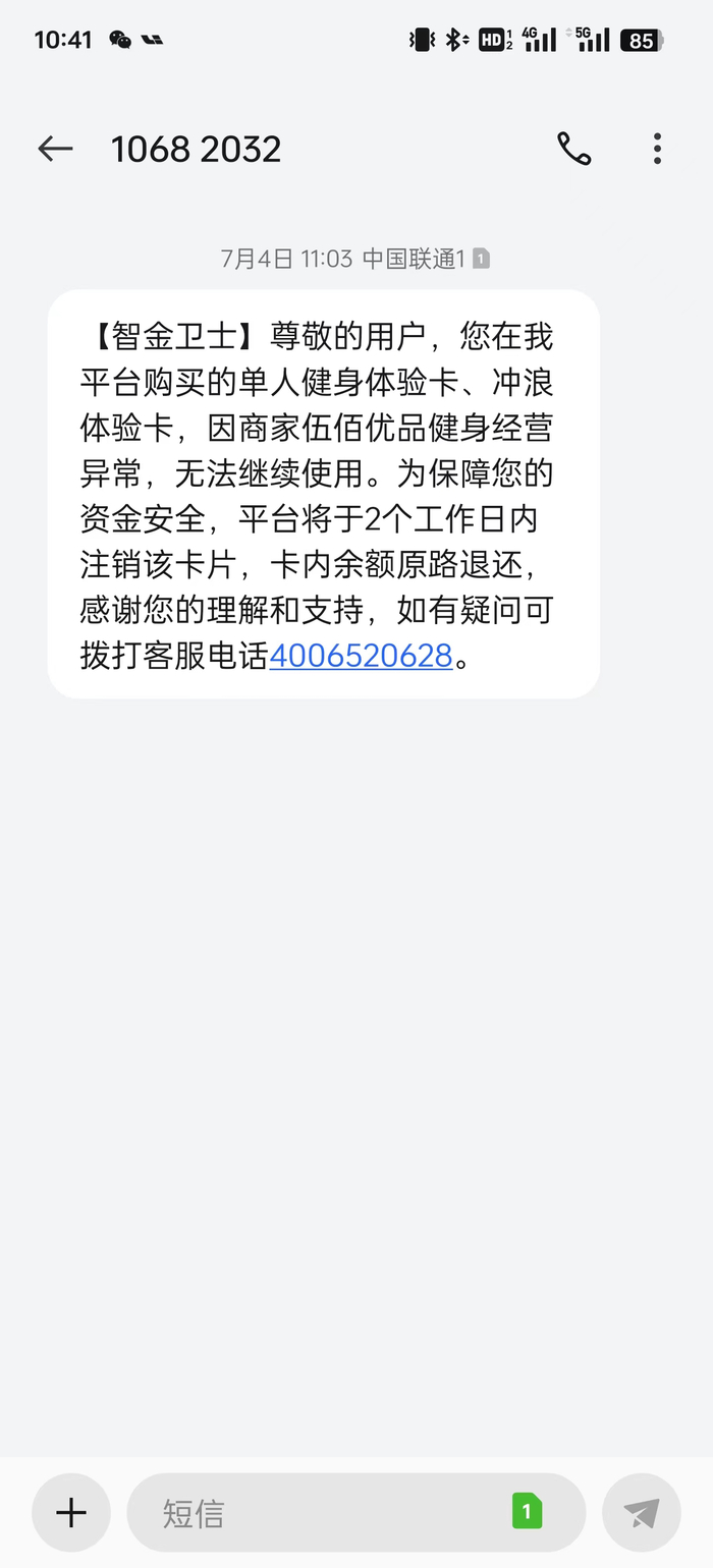 2024年7月4日,通过“智金卫士”平台购入会员卡的消费者收到平台通知,因“伍佰优品健身”经营异常,平台于2个工作日内向“元管家”用户原路退还未消费资金,7月5日,用户已在数字人民币APP中收到退款。