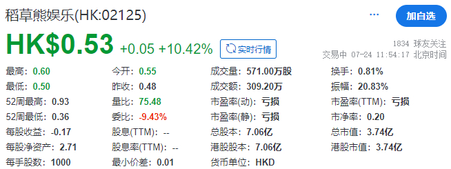 稻草熊娱乐,于2021年1月15日在港交所主板挂牌上市,当时以每股5.88港元的价格发行1.6578亿股,募资约9.75亿港元。截至2024年7月24日午间收市,其收报0.53港元,涨10.42%,目前总市值约3.74亿港元。