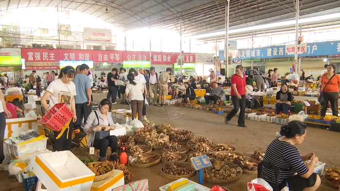 7月22日上午,记者来到云南木水花野生菌交易市场看到,交易区摆满了新鲜的牛肝菌、青头菌、鸡枞、白葱菌、干巴菌等各类野生菌,一筐筐新鲜的菌菇一眼望不到头。
