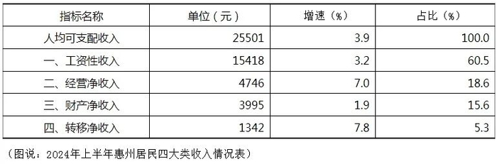 从收入结构来分析,上半年惠州居民四大收入均实现了增长,且收入结构持续优化。从调查数据来看,工资性收入仍然是居民收入增长的压舱石,上半年居民人均工资性收入15418元,同比增长3.2%,占人均可支配收入比重60.5%。