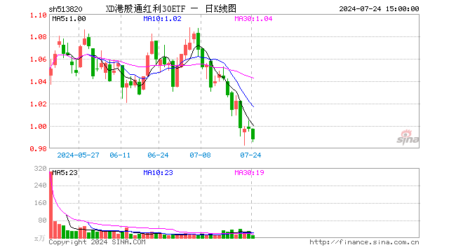 规模方面,截止7月23日,港股通红利30ETF(513820)最新份额为4.84亿份,最新规模为4.74亿元。