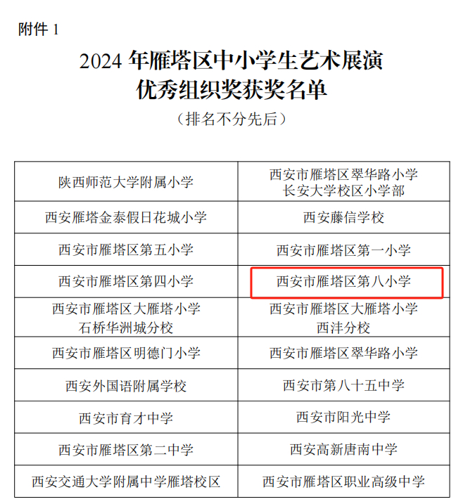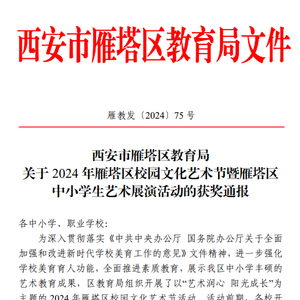 阳光讯(记者 杨小娟)近日,2024年雁塔区校园文化艺术节展演活动获奖结果揭晓,西安市雁塔区第八小学(简称:雁塔八小)荣获2024年雁塔区中小学艺术展演优秀组织奖。