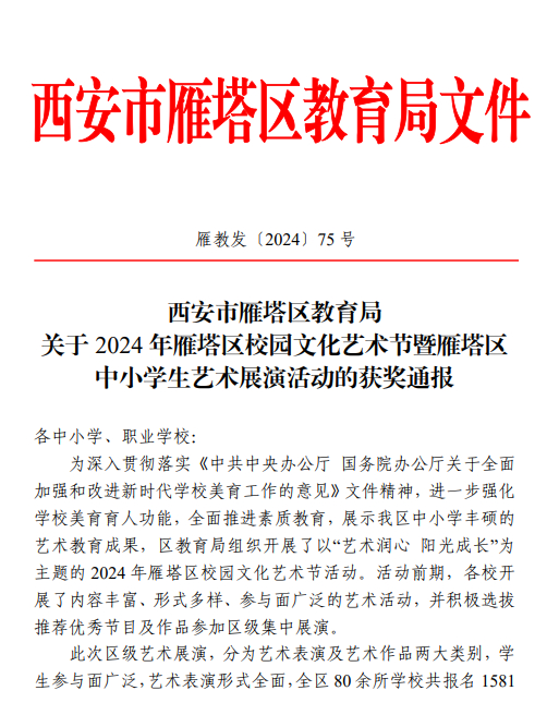 雁塔八小在2024年雁塔区校园文化艺术节展演活动中获奖
