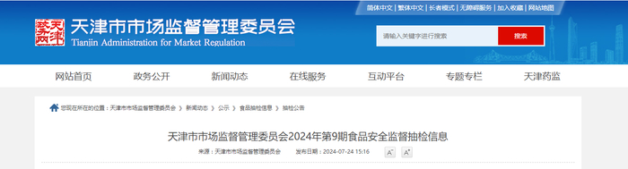 天津市市场监督管理委员会2024年第9期食品安全监督抽检信息