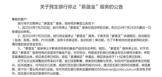蓝鲸新闻7月24日讯(记者 金磊 )近日,民生银行官网发布公告,自2024年7月26日起,该行将全面停止“薪盈宝”服务。