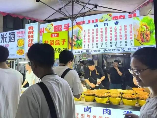 新疆特色羊肉串、老潼关肉夹馍、东北韭菜盒子、河南月亮馍、广西酸嘢……近百个外摆摊位沿着内街依次排列,几乎囊括了全国各个省级行政区的美食。