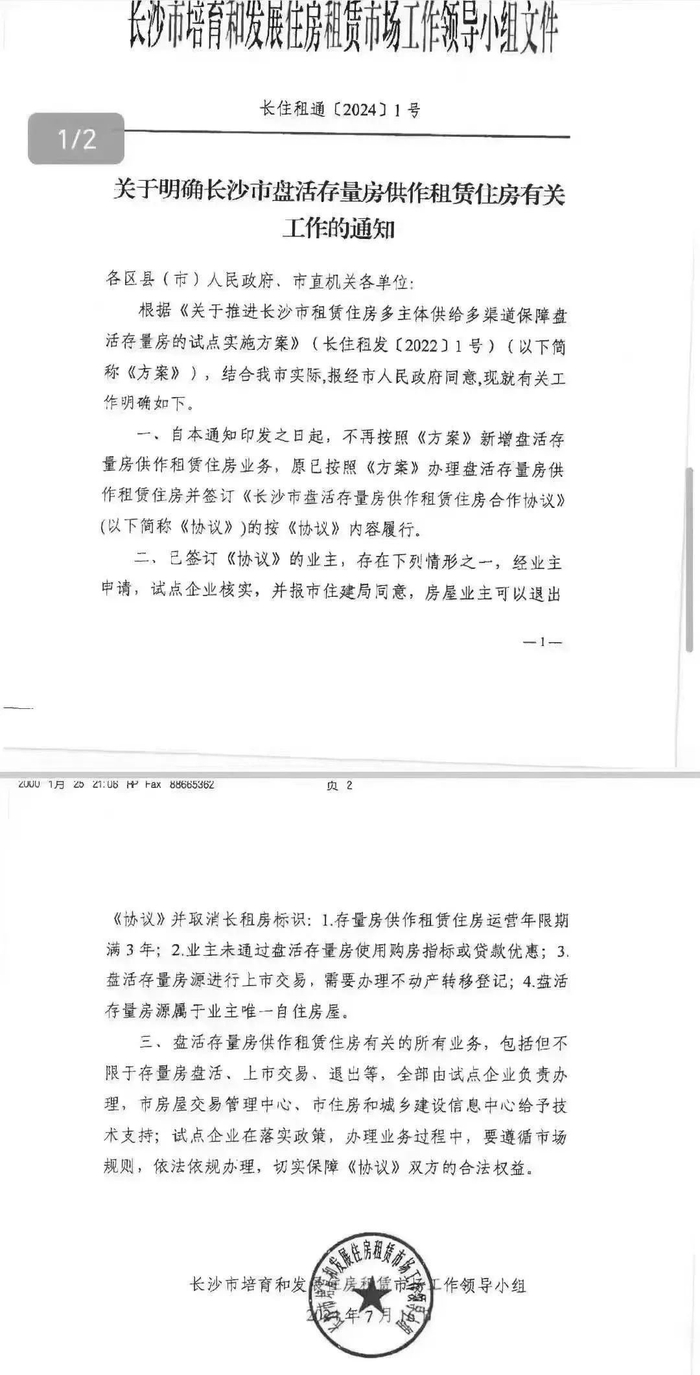 该份由长沙市培育和发展住房租赁市场工作领导小组7月16日印发的文件,除明确自本通知之日起,不再新增盘活存量房供作租赁住房业务外,还就原已办理盘活存量房供作租赁住房业务并签订协议的,作出了相关工作安排:一、按协议内容履行;二、存在下列四种情形之一,房屋业主可以申请退出:1. 当存量房作为租赁住房运营满3年后;2. 业主未能通过盘活存量房获得购房指标或贷款优惠;3. 需要将盘活的存量房源上市交易并办理不动产转移登记;4. 盘活的存量房源是业主的唯一自住房屋。