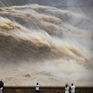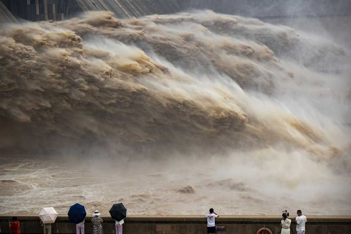 7月24日,河南济源,游客观看黄河小浪底泄洪。自7月18日启动防洪运作以来,黄河小浪底水库持续泄洪,降低水库水位,为汛期腾出更多的防汛库容,迎接黄河防汛关键期的到来。