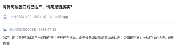 远兴能源 [000683] :阿拉善天然碱项目一期第四条生产线还在试车,由于设备调试等原因尚未达产,公司正在努力推动四线的达产。