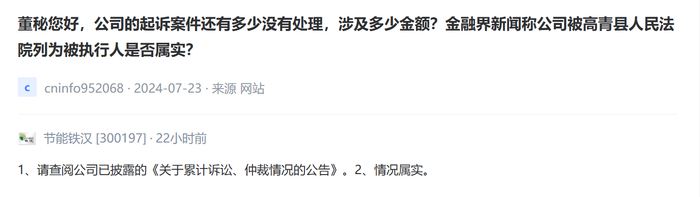 公司的起诉案件还有多少没有处理,涉及多少金额?金融界新闻称公司被高青县人民法院列为被执行人是否属实?