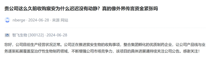 智飞生物[300122] :公司目前生产经营状况正常。公司正在推进宸安生物的收购事项,整合集团孵化的优质制药企业,让公司产品线与业务逐渐拓展覆盖至治疗性生物制药领域,不断增强公司市场竞争力。
