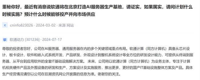 最近有消息说软通将在北京打造AI服务器生产基地,请证实,如果属实,请问计划什么时候实施?预计什么时候能够投产并向市场供应?