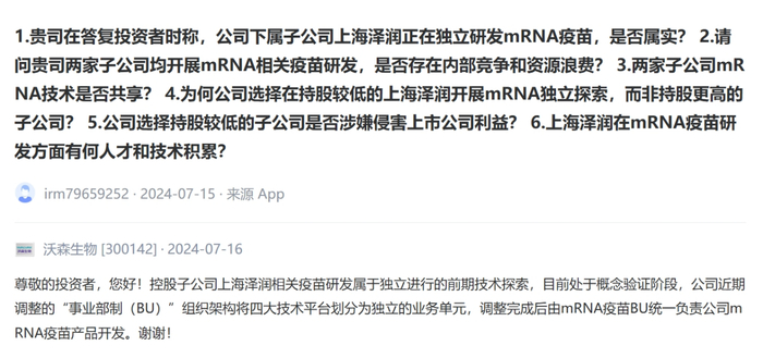1.贵司在答复投资者时称,公司下属子公司上海泽润正在独立研发mRNA疫苗,是否属实? 2.请问贵司两家子公司均开展mRNA相关疫苗研发,是否存在内部竞争和资源浪费? 3.两家子公司mRNA技术是否共享? 4.为何公司选择在持股较低的上海泽润开展mRNA独立探索,而非持股更高的子公司? 5.公司选择持股较低的子公司是否涉嫌侵害上市公司利益? 6.上海泽润在mRNA疫苗研发方面有何人才和技术积累?
