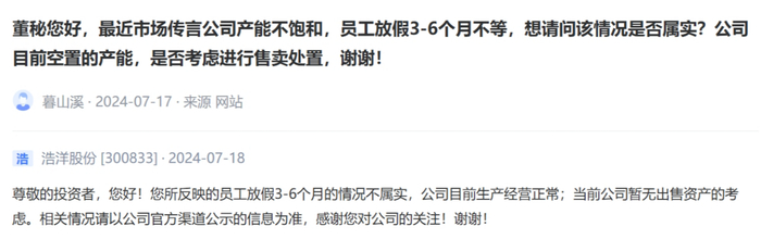 最近市场传言公司产能不饱和,员工放假3-6个月不等,想请问该情况是否属实?公司目前空置的产能,是否考虑进行售卖处置?