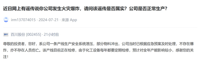百川股份[002455] :系公司一条产线生产安全系统泄压,部分物料冲出,公司当时已根据应急预案及时处理,不存在爆炸,亦不存在人员伤亡。该产线目前正在检修,由于化工设备每年都要定期检修,预计对全年产能影响较小。