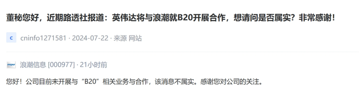 浪潮信息[000977] :公司目前未开展与“B20”相关业务与合作,该消息不属实。