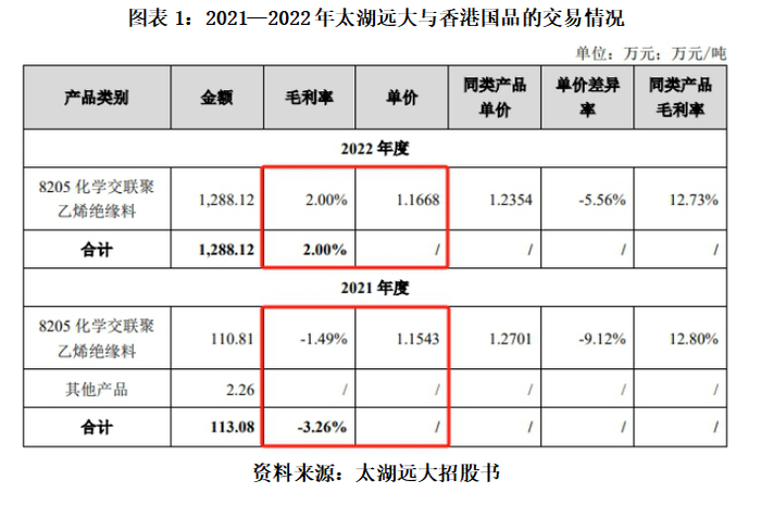更令人咋舌的是,2021—2022年,对于化学交联聚乙烯绝缘料,太湖远大对香港国品销售的毛利率分别仅为-1.49%、2.00%,交易金额分别为110.81万元、1288.12万元,而同期同类产品毛利率分别为12.80%、12.73%。可见,两者之间的毛利率差异高达10个百分点以上。
