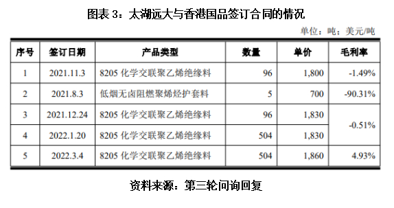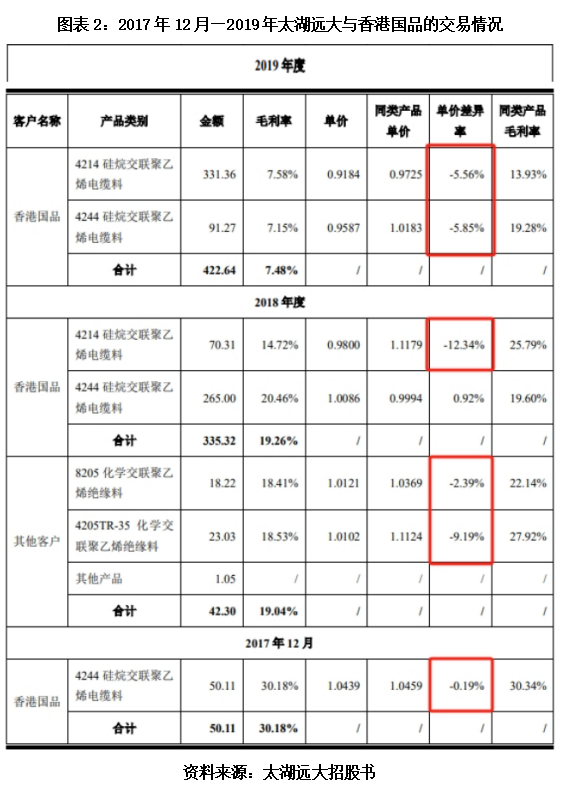 首轮问询函回复显示,自2017年12月双方合作起,太湖远大向香港国品销售的硅烷交联聚乙烯电缆料和化学交联聚乙烯绝缘料的单价、毛利率普遍低于其他客户。