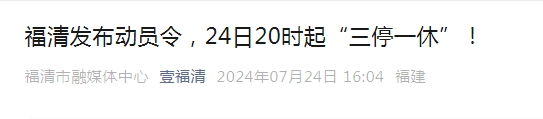 在上述通知发布前,福州市辖的县级市福清市已发布紧急动员令,其中提到从7月24日20时起到防台风Ⅰ级应急响应结束之前,在福清全市范围内实行“三停一休”。