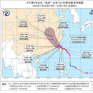 降水预报:7月24日20时至25日20时,浙江东南部、福建大部、台湾岛等地有大到暴雨,其中,浙江东南部、福建东部、台湾岛等地部分地区有大暴雨,台湾岛有特大暴雨(250-800毫米)。