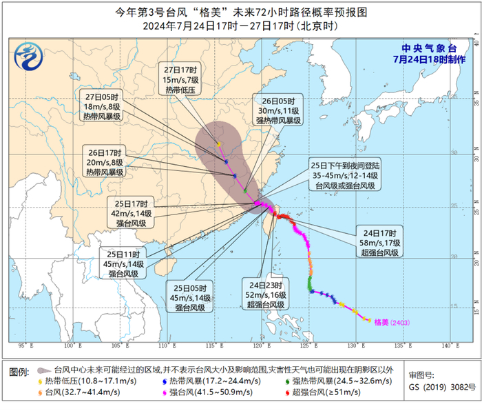 今年第3号超强台风级“格美”的中心今天(24日)下午5点钟位于我国台湾省宜兰县东南方大约70公里的洋面上,就是北纬24.1度、东经121.9度,中心附近最大风力有17级(58米/秒),中心最低气压为925百帕,七级风圈半径250-380公里,十级风圈半径100-120公里,十二级风圈半径55-65公里。