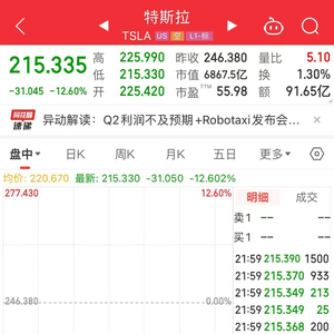 其中,值得注意的是,特斯拉开盘跌超8%,随后跌幅迅速扩大超10%,截至发稿,特斯拉股价跌幅扩大至12.6%,为7月2日以来新低,总市值回落至7000亿美元以下。