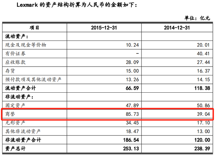 根据利盟的相关数据显示,2015年利盟的商誉85.73亿,占到公司总资产的33.75%,而当年公司的净资产只有71亿,换句话说,如果刨除掉不产生任何价值的商誉,纳思达在2016年用258亿的对价收购了一家净资产为负(不考虑商誉)的公司。