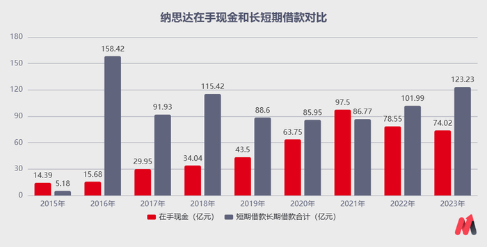 纳思达当前同样也存在存贷双高的情况。从公司的资产负债表来看,这几年纳思达在手握巨大现金的同时,账上仍有巨大的长短期借款。以最近一期的报表数据来看,2023年公司的库存现金74.02亿,长短期借款高达123.23亿,而在2021年,公司的库存现金一度超过长短期借款,都接近百亿。