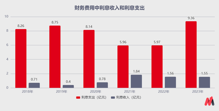 在过去的几年中,纳思达每年的利息支出就平均在8个亿左右,以2023年为例,当年利息支出9.36亿,线性计算其借款利率在7.6%,而当年纳思达的利息收入也仅有1.55亿,线性计算其存款利率仅有2.1%,相差5个百分点,净利息支出达到7.8亿。