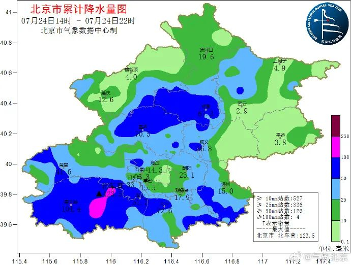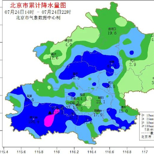 据统计,7月24日14时至22时,全市平均降雨量31.3毫米,城区平均24.3毫米,西南46.5毫米,东南37.5毫米,西北30.2毫米,东北23毫米;城区最大朝阳郎各庄78.5毫米,全市最大房山北车营123.5毫米,最大小时降水强度昌平西峪67.2毫米/小时(24日19时-20时)。