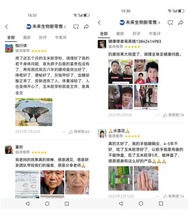 不仅如此,这位销售代理还向记者推荐了“未来生物新零售”的公众号,这一由官方直接管理的公众号评论区内,同样充斥着大量关于食用玉米胚芽粉可以治病的说法,治疗范围,不仅包括糖尿病病、尿酸高、偏头痛、肺结节、各种内科疾病等,甚至还有本来属于器质性病变的腰间盘突出、灰指甲、手指腱鞘炎等,无论何种病症,都能在食用几天的玉米胚芽粉之后神奇康复,更有人称,食用玉米胚芽粉后皮肤变白、变美。