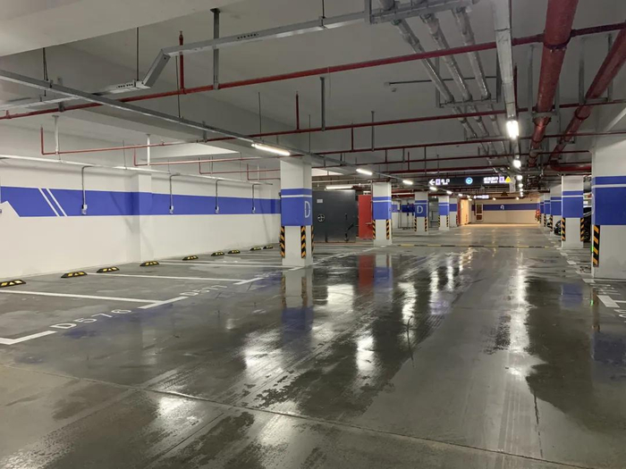 地下车库整体整洁明亮,车库与电梯间的大门标识清晰、装饰有灯带,车库部分区域有返潮情况,水痕明显。