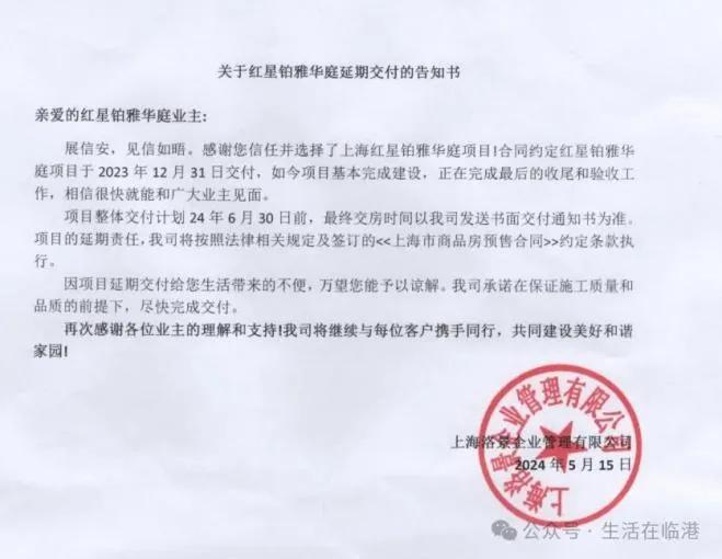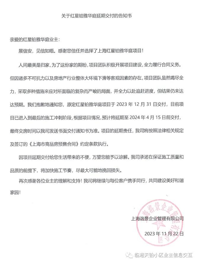 但2023年11月,项目公司上海洛景企业管理有限公司发布项目延期交付告知书。
